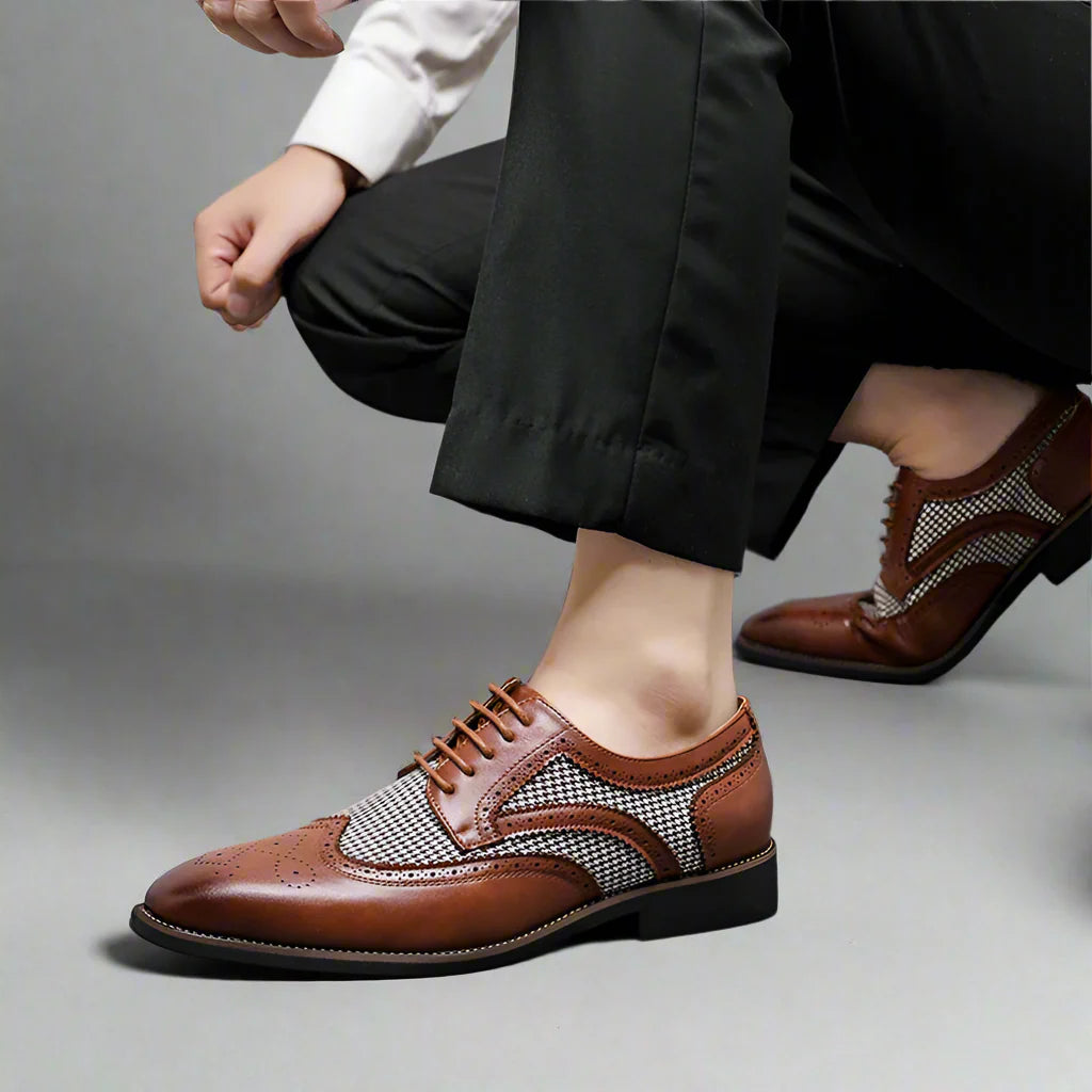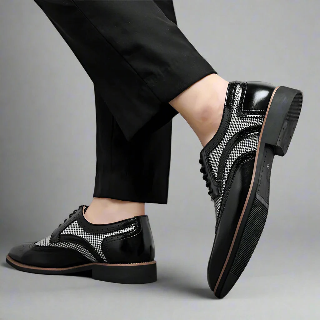Elevate your style with our latest shoes, crafted from precision-perforated leather and featuring a striking houndstooth textile panel. These shoes blend heritage and modernity for a unique urban flair inspired by New York's fashion scene.